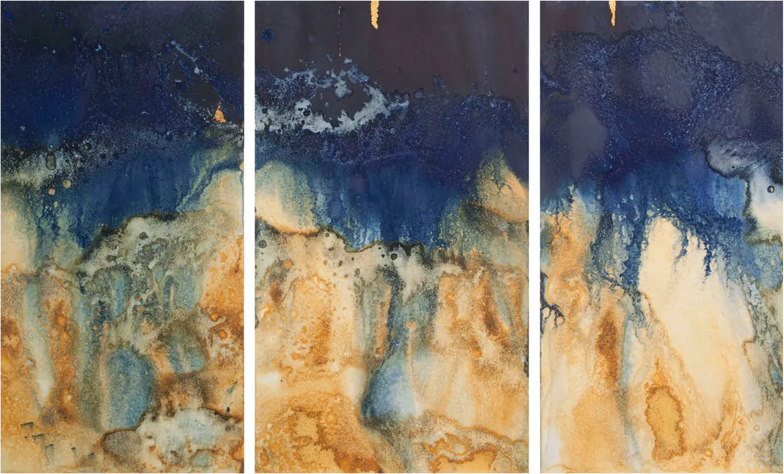 Một trong những tác phẩm tiêu biểu là Littoral Drift Nearshore (Dạt Bờ), lấy cảm hứng từ thuật ngữ địa chất chỉ hoạt động của sóng và gió di chuyển cát sỏi ven biển. Littoral Drift Nearshore là bộ ba bức tranh hoạ ba con sóng hòa quyện với tro mưa từ núi Jolly và đám cháy rừng Eagle Creek. Về mặt hình thức, tác phẩm thể hiện sự chuyển dịch mượt mà từ sắc xanh đậm ở trên xuống tông nâu vàng dưới đáy, gợi hình ảnh tầng lớp địa chất bị xói mòn. Các vệt loang lổ, giống như dòng chảy hỗn loạn, không phải ngẫu nhiên mà là dấu ấn vật lý của tự nhiên – sóng đánh, tro rơi, gợi một cảm quan bề mặt gần với hội họa trừu tượng hơn là nhiếp ảnh truyền thống. Sự trác tuyệt, vẻ đẹp hùng vĩ của thiên nhiên chứa đựng sự hủy diệt như đám cháy rừng len lỏi vào khung hình qua lớp tro xám.