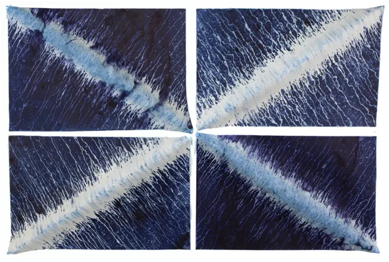 Chảy bất tận vào ký ức nguyên thủy, cyanotype và lụa hòa quyện hài hòa với bản chất của nước qua chính quá trình hình thành hình ảnh. Ở bộ Eternal Flow, vốn được “tạo thành trong nước”, như một nghi thức giao cảm với tạo hóa, mỗi tác phẩm khắc họa những hình thái đa dạng của nước: từ những gợn sóng dịu dàng vuốt ve bờ cát, đến dòng chảy cuồn cuộn như dòng sông thời gian, hay những giọt nước lấp lánh dưới ánh nắng, phản chiếu lấy sự vận động liên tục của sự sống và tình yêu. Nước gắn kết, tan chảy rồi tái sinh.
