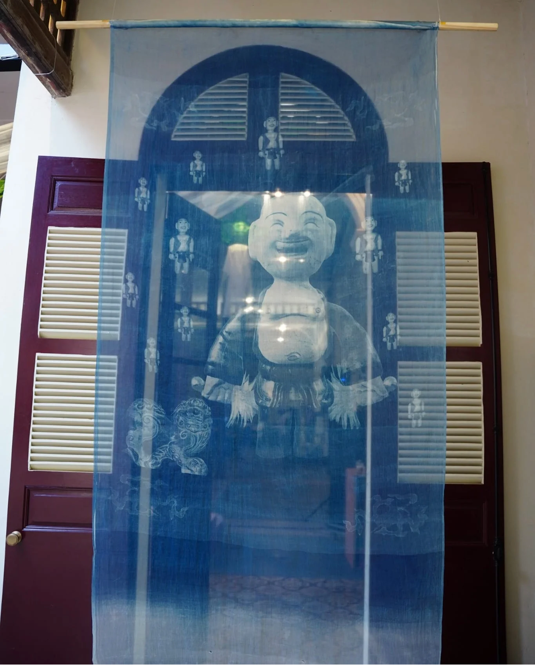 Tác phẩm lụa in Cyanotype hình tượng chú Tễu của nghệ sĩ Phạm Tuấn Ngọc trong bộ Ngũ Hành