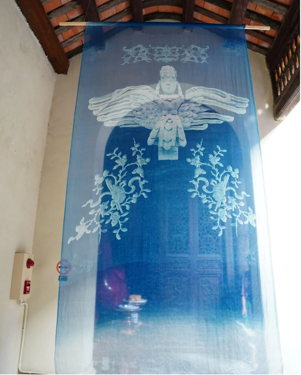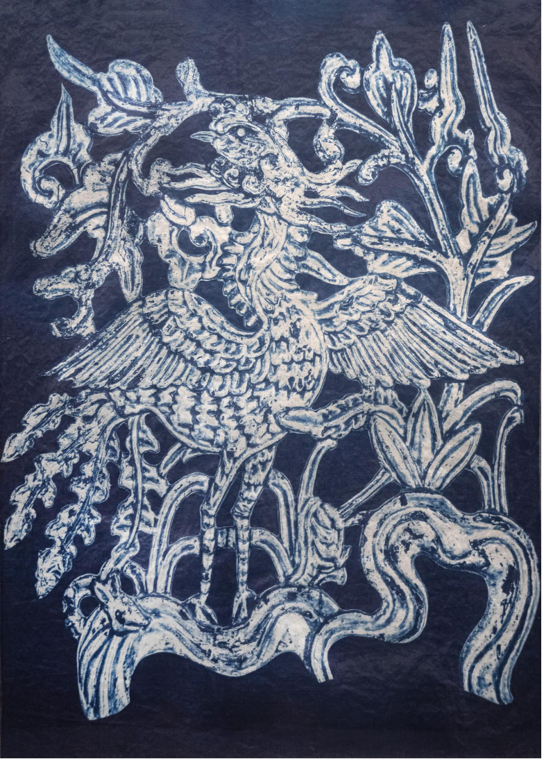 Mở ra cánh cửa dẫn vào cõi thần thoại, từ hình tượng nàng tiên khắc trên phù điêu Đình Hữu Bổ, Phú Thọ, “con rồng, cháu tiên” hiện lên trên nền lụa tơ tằm trắng ngà, nàng tiên với dáng hình Việt và đôi cánh phượng sải dài được khắc họa bằng sắc xanh huyền ảo của cyanotype. Kỹ thuật này, vốn đòi hỏi sự chính xác tuyệt đối trong pha trộn hóa chất dưới ánh nắng, rất thách thức khi áp dụng trên lụa – chất liệu “đỏng đảnh” nhưng lộng lẫy.